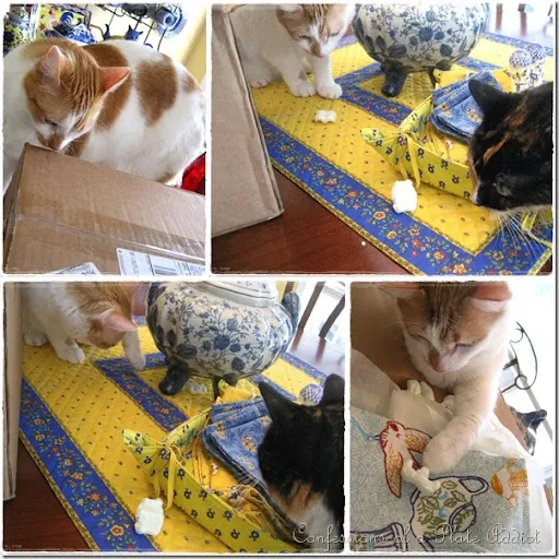 Of course, as soon as it came in the door, the staff had to inspect it! I do appreciate their helpfulness, but finally managed to distract them with the shipping peanuts! Now I can show you what I found inside…