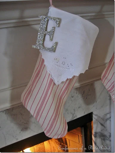 And here’s another peek at the stockings I made to match, using more French ticking and a pretty vintage napkin to finish them off. (You can find the tutorial