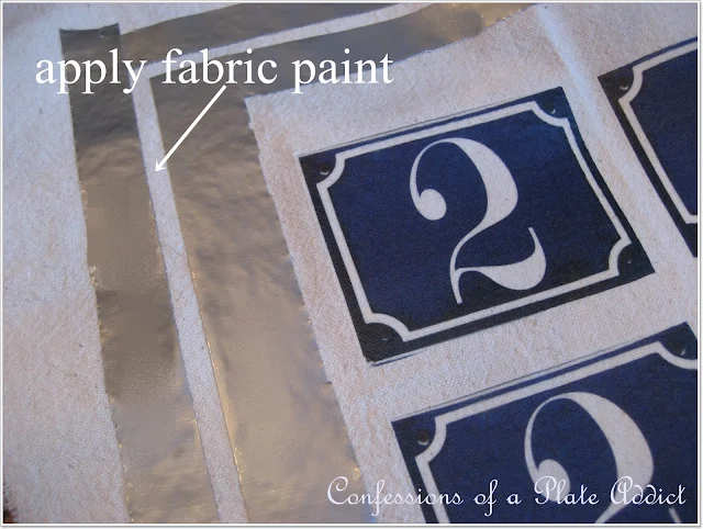 Then I drew lines for the stripes I wanted to add, edged the lines with duct tape…although painter’s tape would be fine. I just seem to have lots of duct tape! I filled in the lines with fabric paint…a half and half mix of soft black and navy to match the plaques.